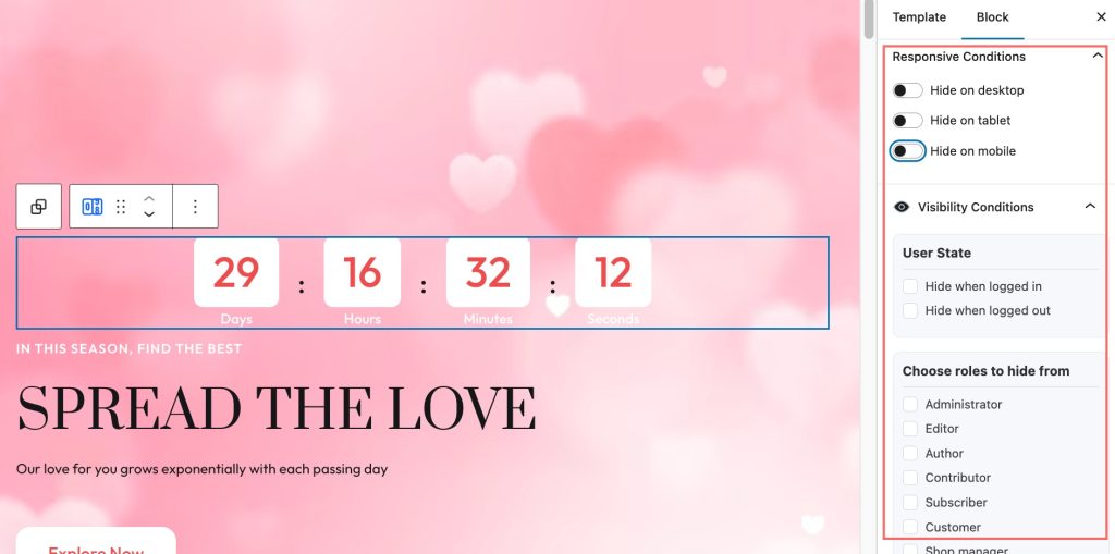 Once you are done with all the tweaks and adjustments, you are all set to preview the countdown timer on your site live. Let’s see full of the Valentine’s vibe on our WordPress website.